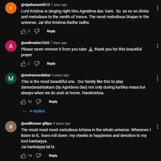 Another example, Damodarastakam a melodious song accompanied during Kartik month Ghee lamp offerings which we covered above. Sung by millions of Hindus globally, during the month of Kartik.