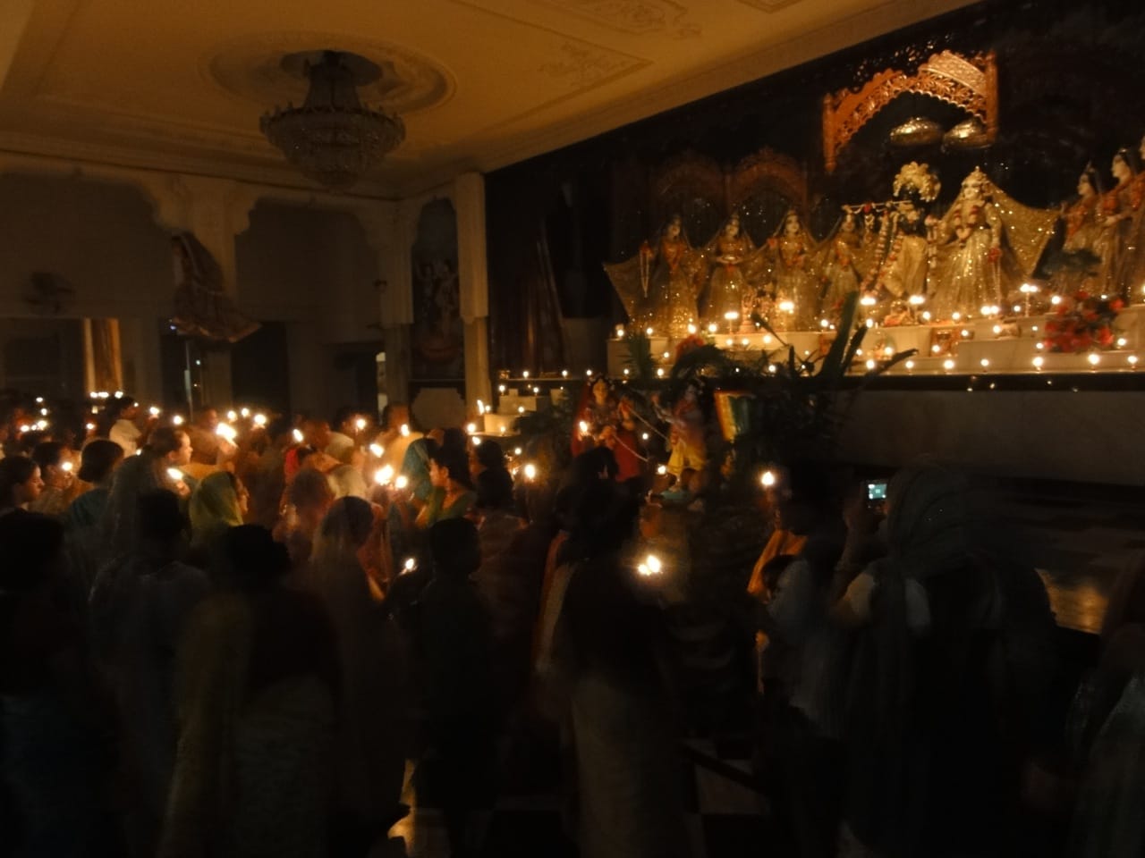 In Radha Krishna temple, Mayapur India, it is a wondrous sight to behold of many devotees offering ghee lamps and ghee sticks to the deity, Krishna to the tune of devotional songs.